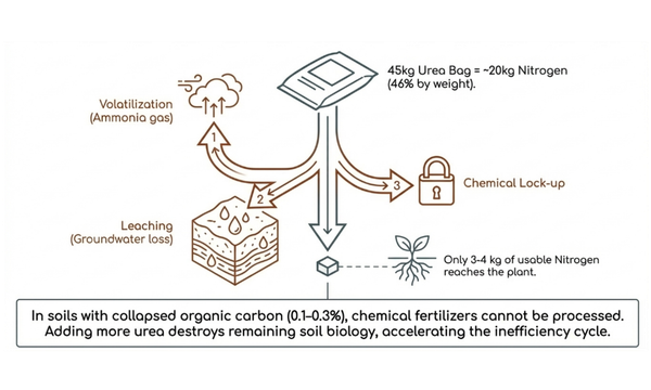 Consider the economics of just one input: urea. A 45 kg bag contains about 46% nitrogen – roughly 20 kg. But in degraded soil with low biological activity, the plant receives only 3–4 kg of usable nitrogen from that bag. The rest volatilizes into air, leaches into groundwater, or binds into forms the plant can’t access. The farmer pays for the full bag. The plant gets a fraction.